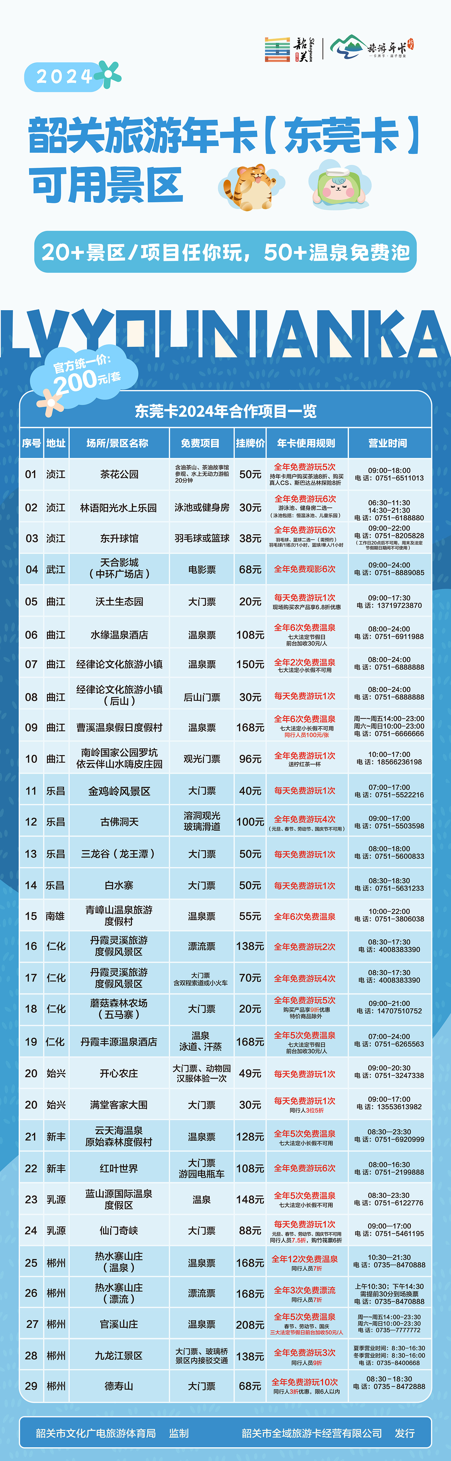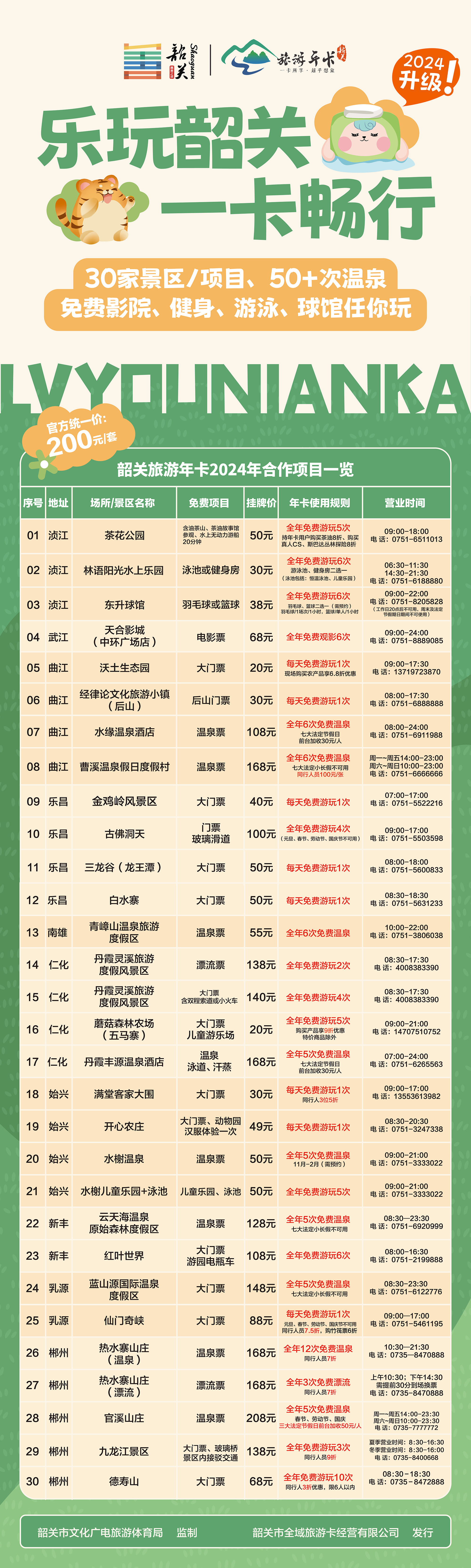 韶关旅游年卡所含旅游景区以韶关市域(含县市)内备案收费景区(点)为主,实行分批纳入,逐年调整。调整以最新发布的公告为准。